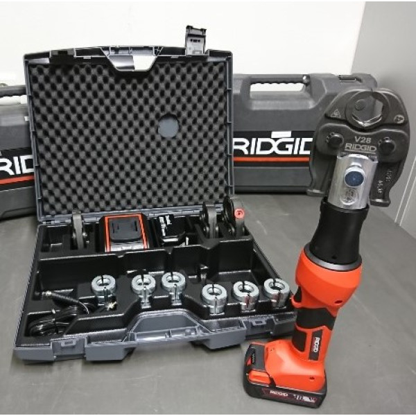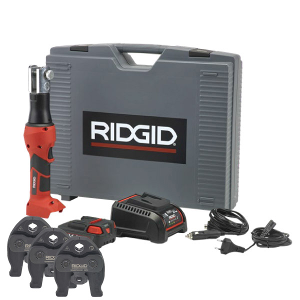 RIDGID MINI RP 219 présgép, Préspofák (szettek alapján), 1x Akkumulátor 18V 2.5Ah, Gyorstöltő 18V hálózati csatlakozással + 1x autós töltő, koffer